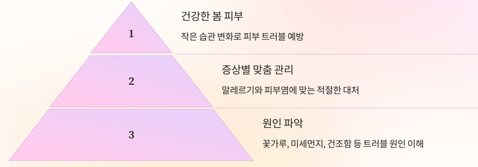 | 원인 | 꽃가루, 미세먼지 등 외부 항원 | 건조한 피부, 자극적인 화장품, 면역 반응 |
